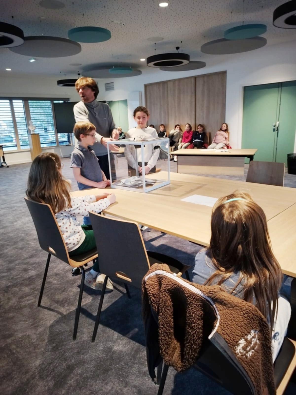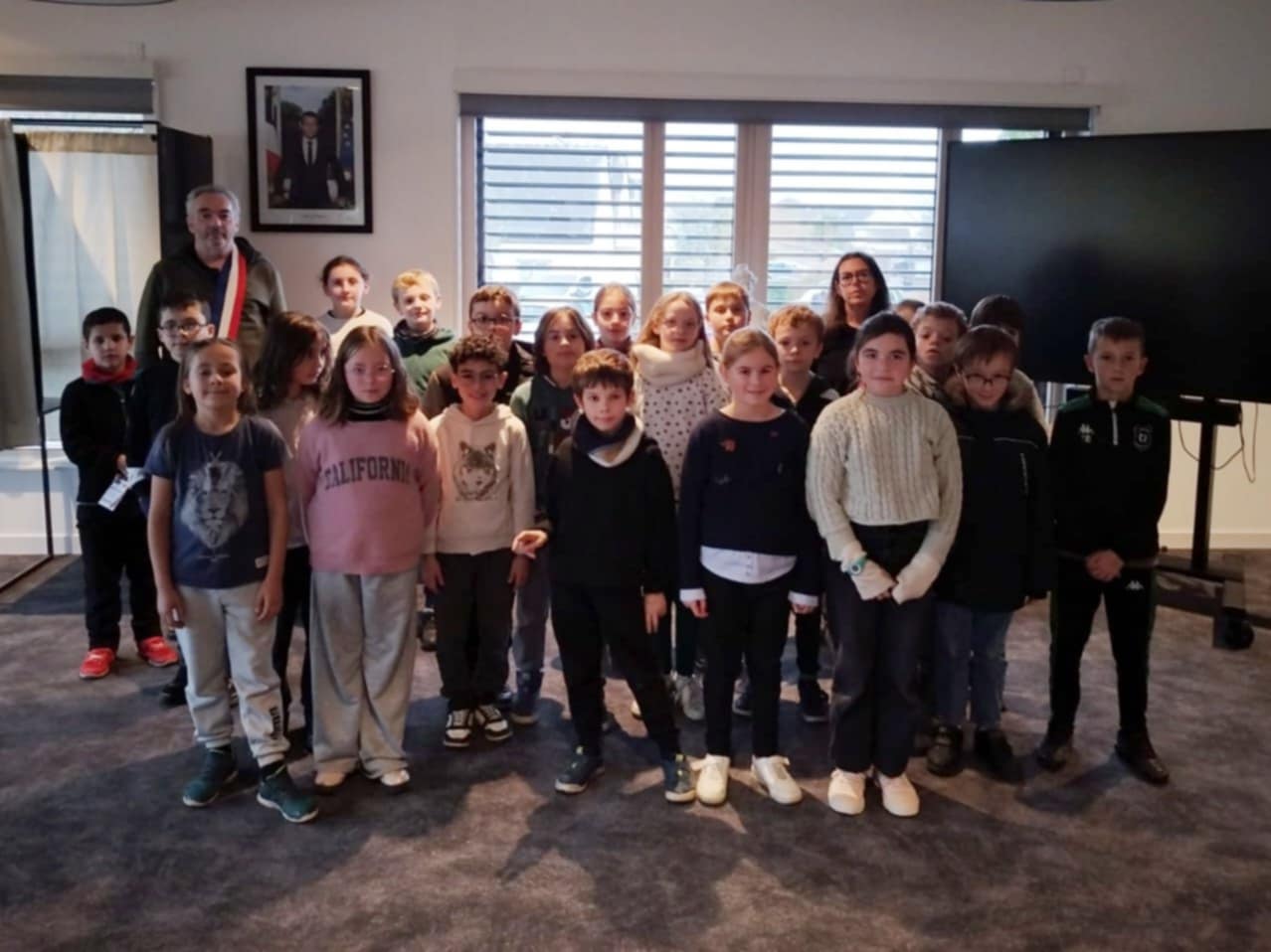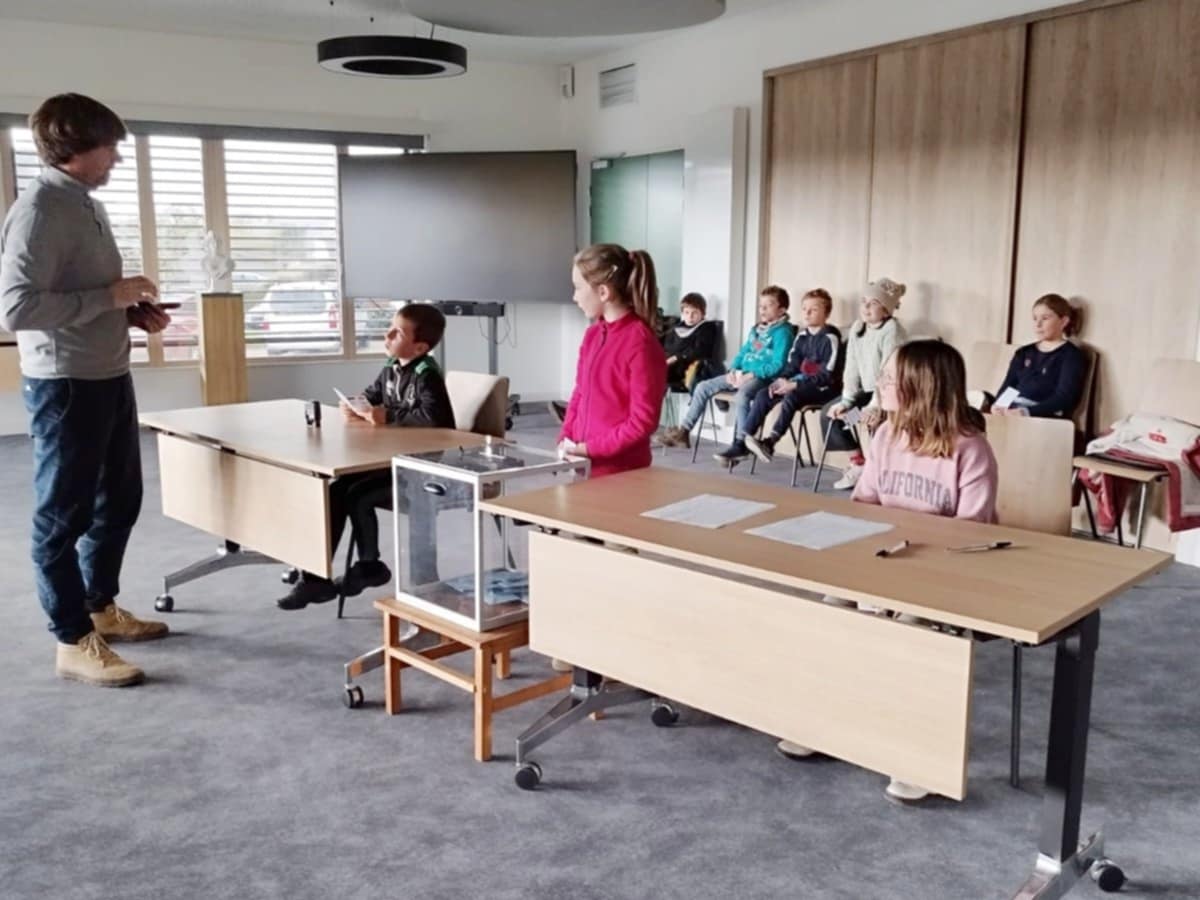« Quatre candidats se sont présentés pour le CME, ils ont fait des affiches et un discours. Puis, le 20 novembre, nous sommes allés à la mairie pour voter. Chacun avait une carte d’électeur. Dans la mairie, il y avait des isoloirs et une urne. Les trois candidats élus sont Arya, Clovis et Raphaëlle. C’était bien. » (texte écrit par Zélie)