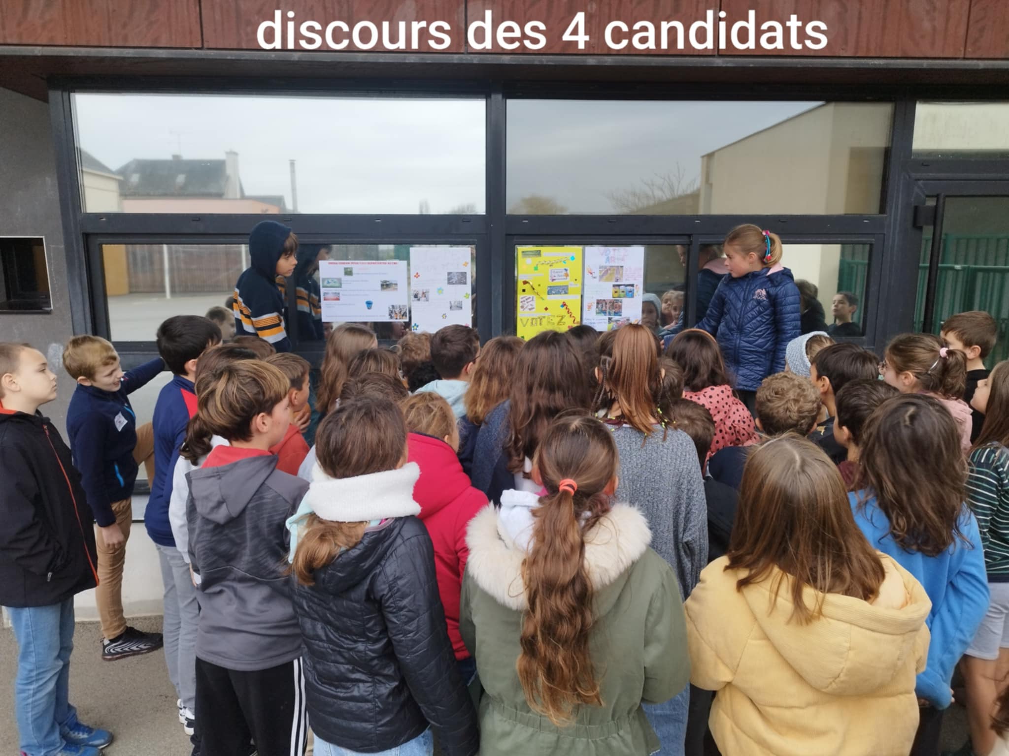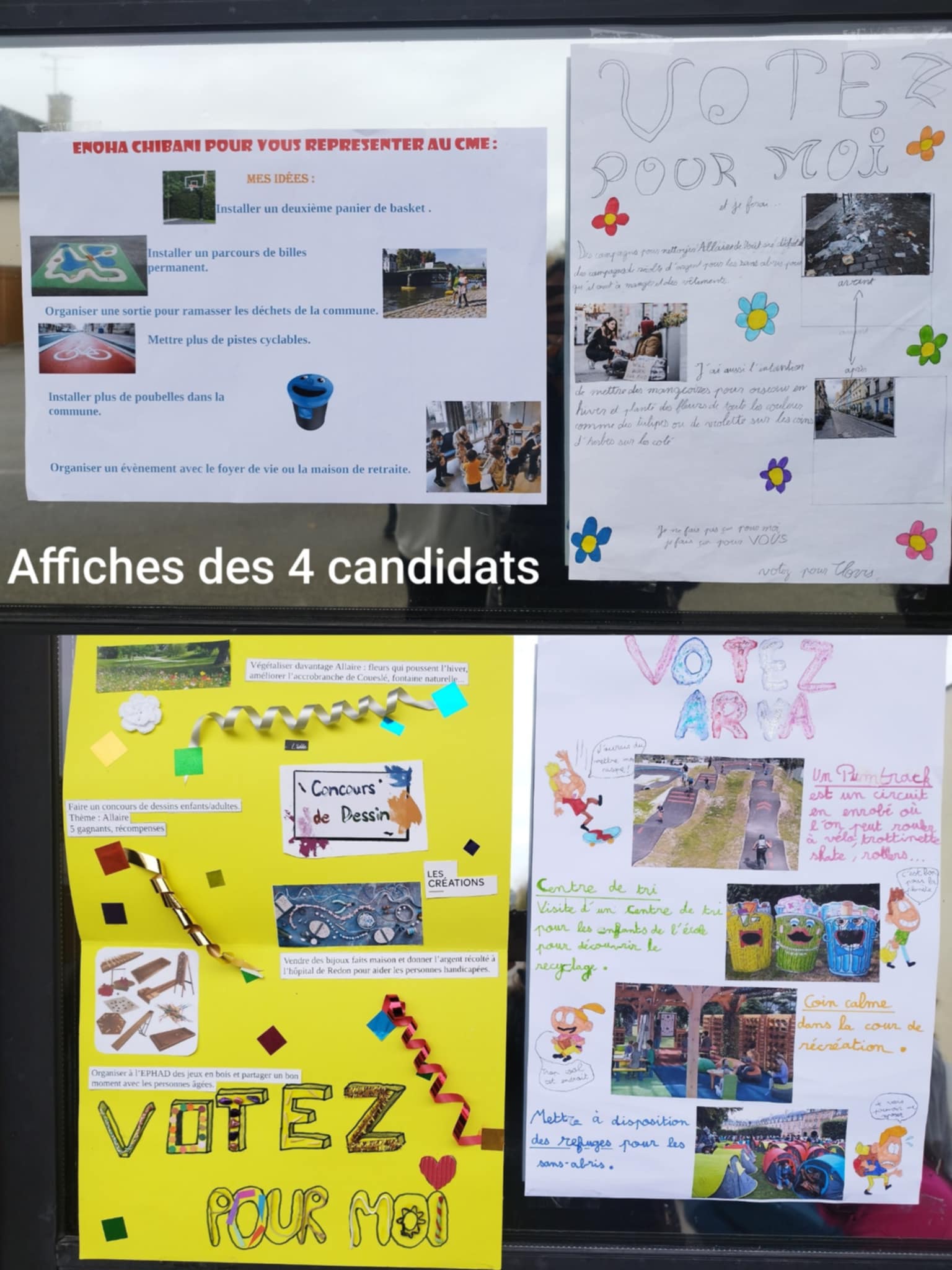 « Quatre candidats se sont présentés pour le CME, ils ont fait des affiches et un discours. Puis, le 20 novembre, nous sommes allés à la mairie pour voter. Chacun avait une carte d’électeur. Dans la mairie, il y avait des isoloirs et une urne. Les trois candidats élus sont Arya, Clovis et Raphaëlle. C’était bien. » (texte écrit par Zélie)